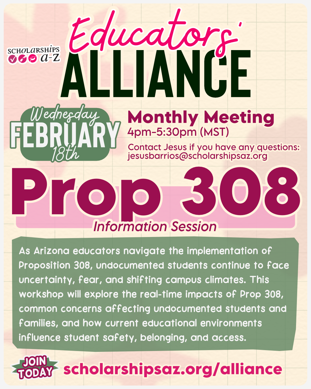 Scholarships A-Z’s Educator Alliance is a community of immigrant and accomplice educators that create a space to share knowledge, challenge and support one another, and advocate for, and alongside, Undocumented youth.